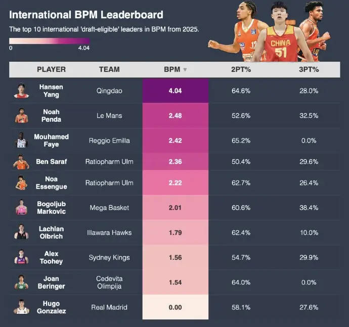 2025级选秀国际球员BPM排行:杨瀚森断档领跑
